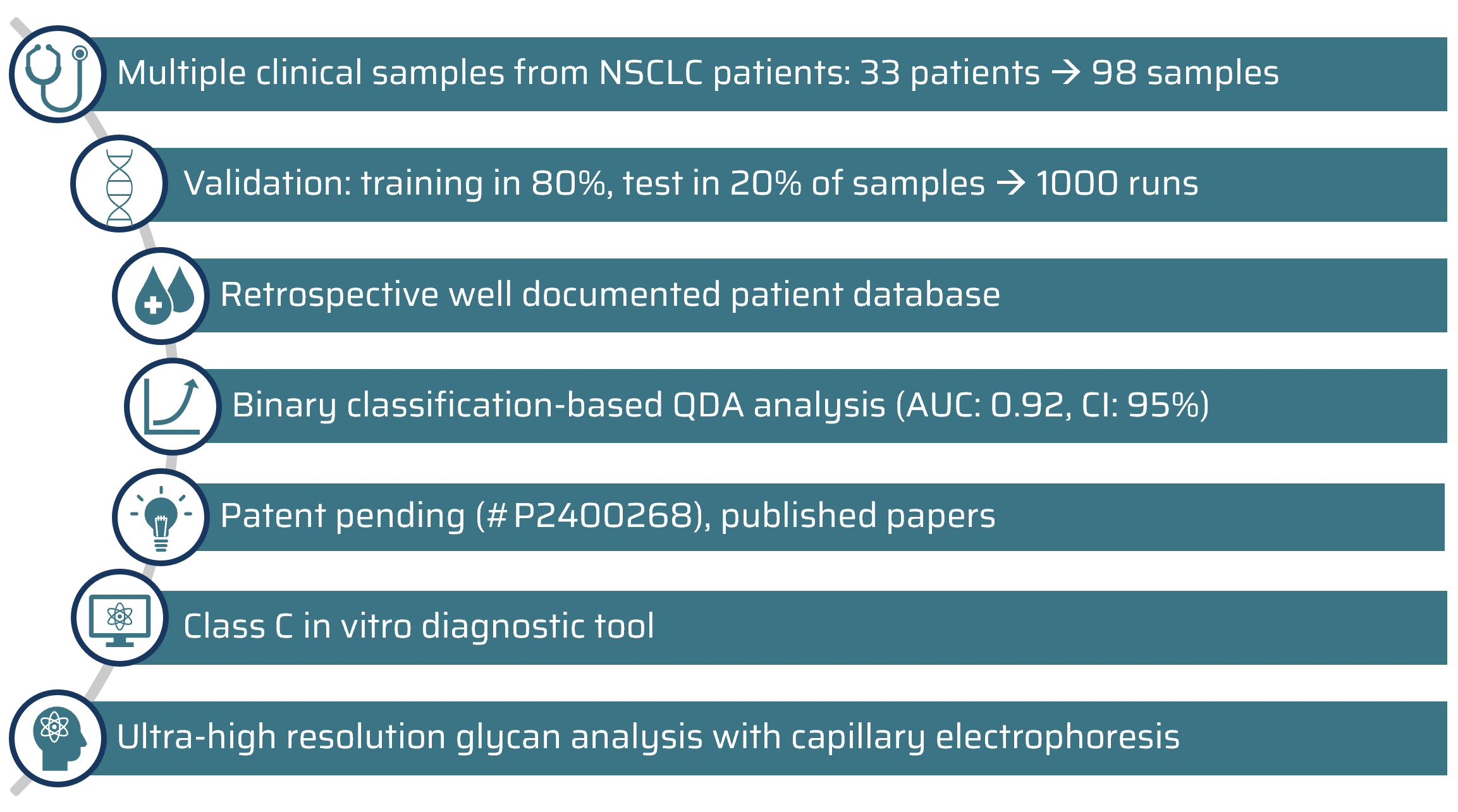 Our proprietary method, currently under patent pending status (#P2400268), combines ultra-high resolution glycan analysis with advanced machine learning to predict chemotherapy effectiveness in lung cancer patients.